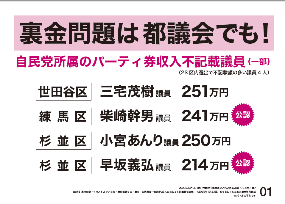 もっとも、裏金問題は旧安倍派だけではありません。さらに、都議会自民党でも問題となっていて、選挙の公認さえ出している(※パネルは6月6日のものですが内容は同じです)。