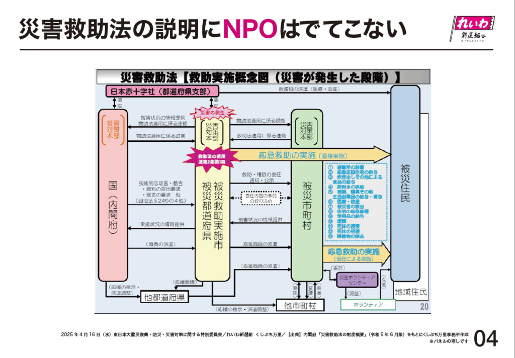 これまで被災者救助法においては災害NPOは無視されているのが現実です。