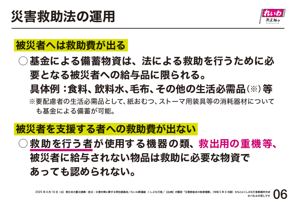 山本太郎代表が予算委員会で、重機のリース代や燃料費を災害救助費から出せるよう、石破総理に求め、なんとか認めさせました。