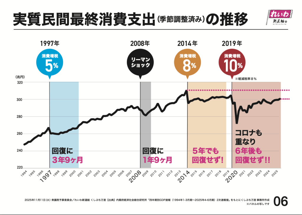 特に、2014年に8%に上がった時、2019年に10%に上がった時、その直後のコロナ禍もありますが、消費は、それ以前の水準にいまだ回復していないのです。もう11年にもなります。
