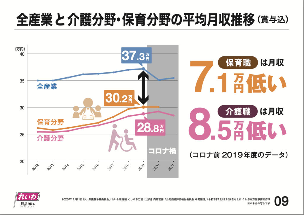 介護や、保育などの分野では、賃金が低すぎる現状があります。全産業平均よりも、年収が100万円、月にして7ー8,5万円も低い。