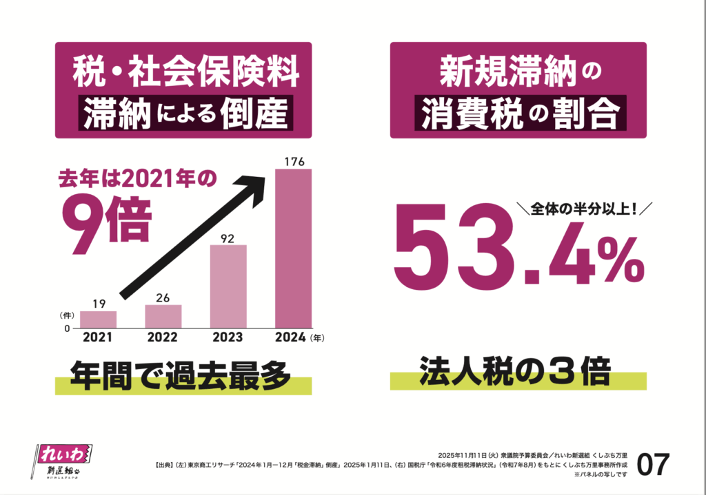 このパネルにあるように、税と社会保険料が重いことによる倒産件数が、2021年から2024年にかけて9倍に増えています。