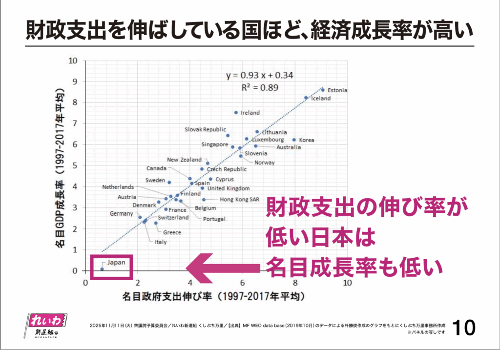 日本のGDP6割は個人消費ですから、国全体の経済が伸びないときこそ、国債を大量発行し、積極財政で、国民生活を救うべきです。次のパネルは、財政支出を伸ばしている国ほど、経済成長率が高いことがわかります。日本の成長率がなぜ低いのか、一目瞭然ですね。