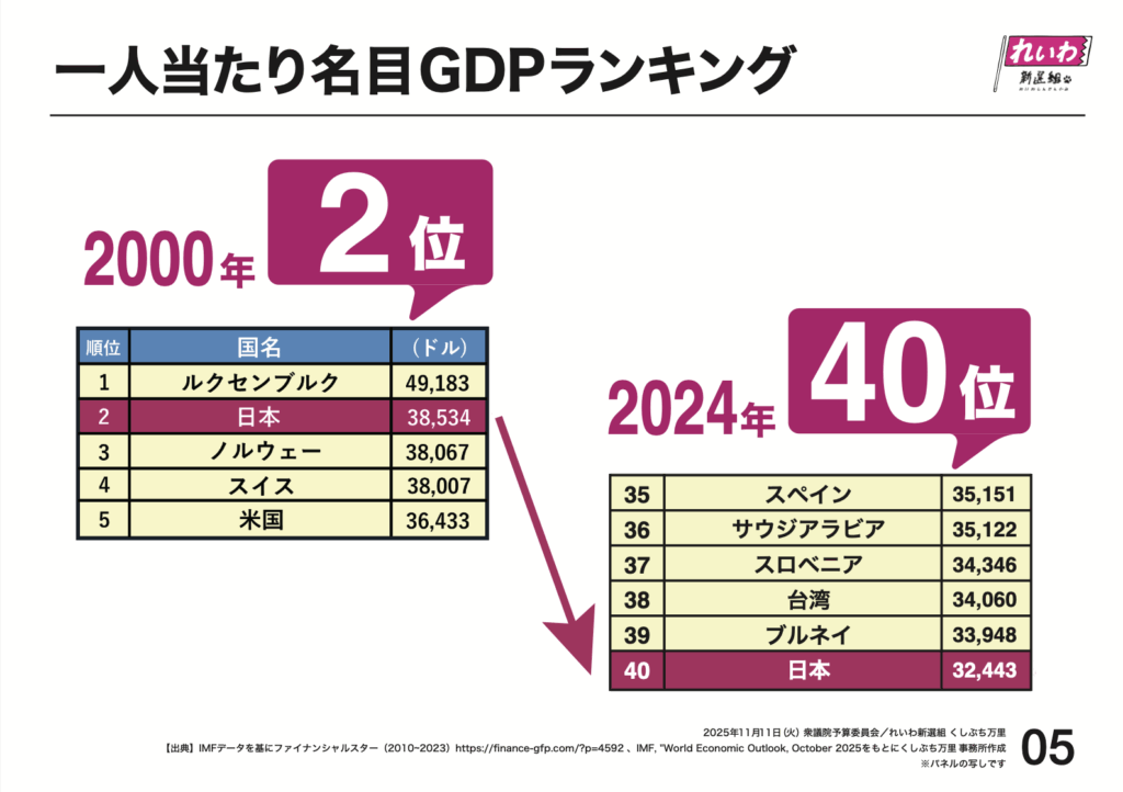一人当たりGDPも、日本は世界第4位だったのが、2024年には第40位に下落しています。