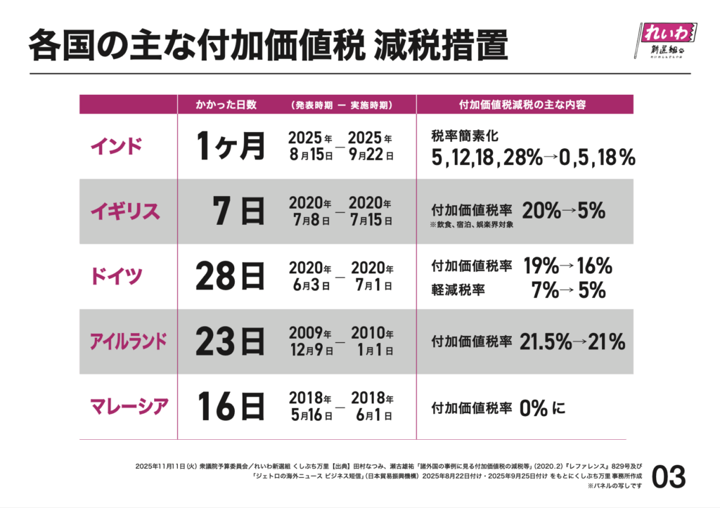 各国では、一週間から一カ月くらいで、消費税減税をやっています。先日インドも、トランプ関税の影響から国内の内需活性化させるために消費税減税に踏み込み、一カ月で実行しています。