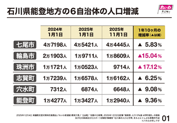 とくに奥能登(珠洲市、輪島市、穴水町、能登町の2市2町)の人口が大きく減っていることを指摘、
