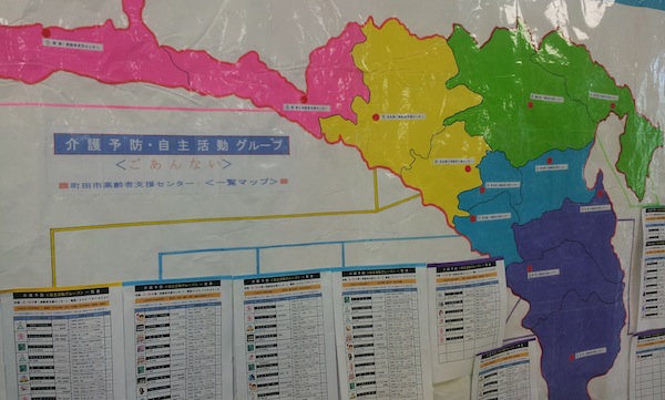 写真は、介護予防の自主活動を紹介する町田市のマップです(町田市役所1階フロア)。