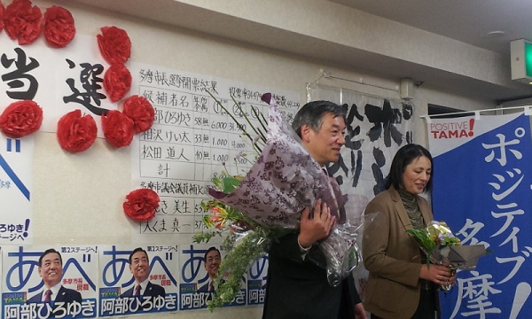 13日、多摩市長選の投開票が行われ、夜10時頃に、現職市長の阿部ひろゆき候補の再選が決まり、2期目をスタートさせることになりました。ご支援をいただいた多くの皆さま、ありがとうございました。