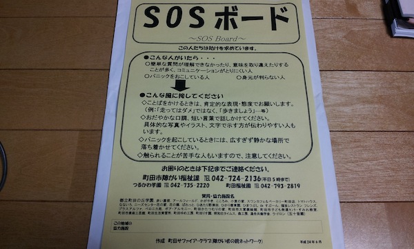 「SOSボード」、上記写真をみてください。パニック状態の知的障がい者の方に街などで遭遇した場合にどう対処したら良いのか、その方法についてサファイア・クラブの皆さんが作成されました。きっかけは、2007年に佐賀県で起こった知的障害者の警官による取り押さえによる死亡事件だったそうです。こうした事件が起らないよう広めていきましょう。